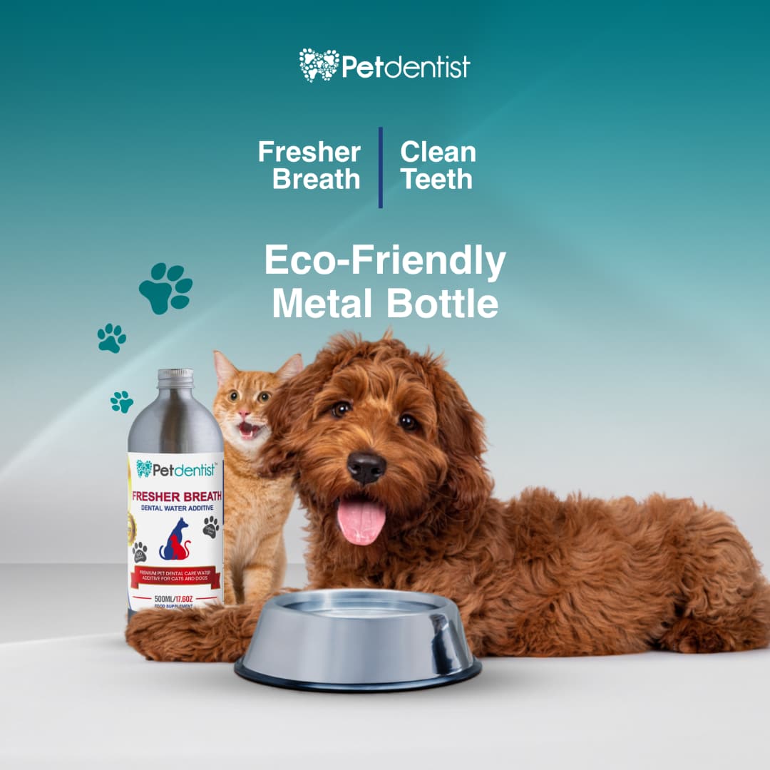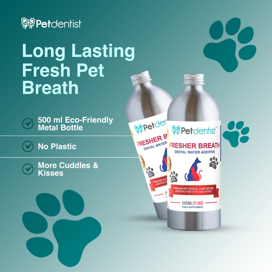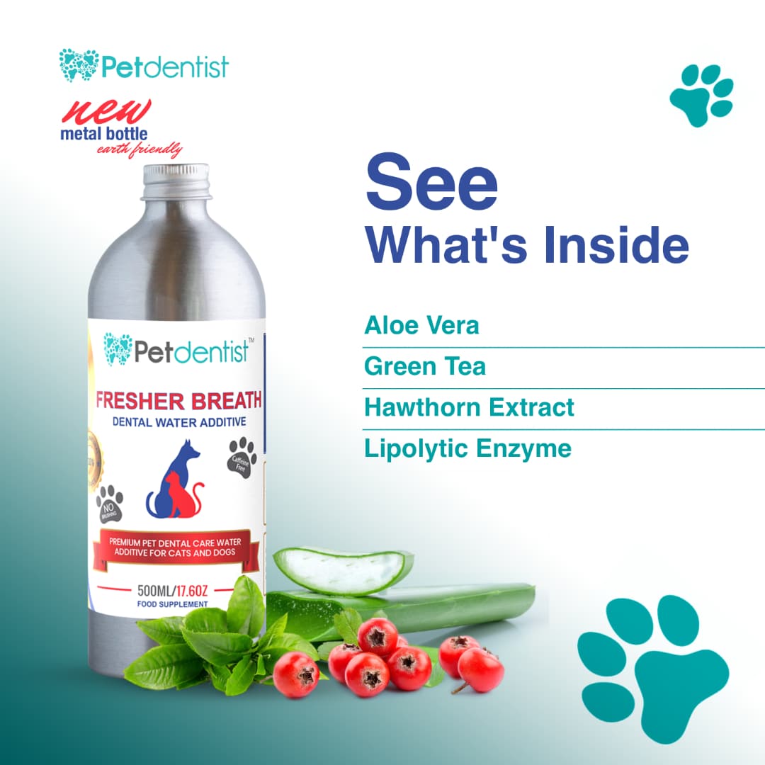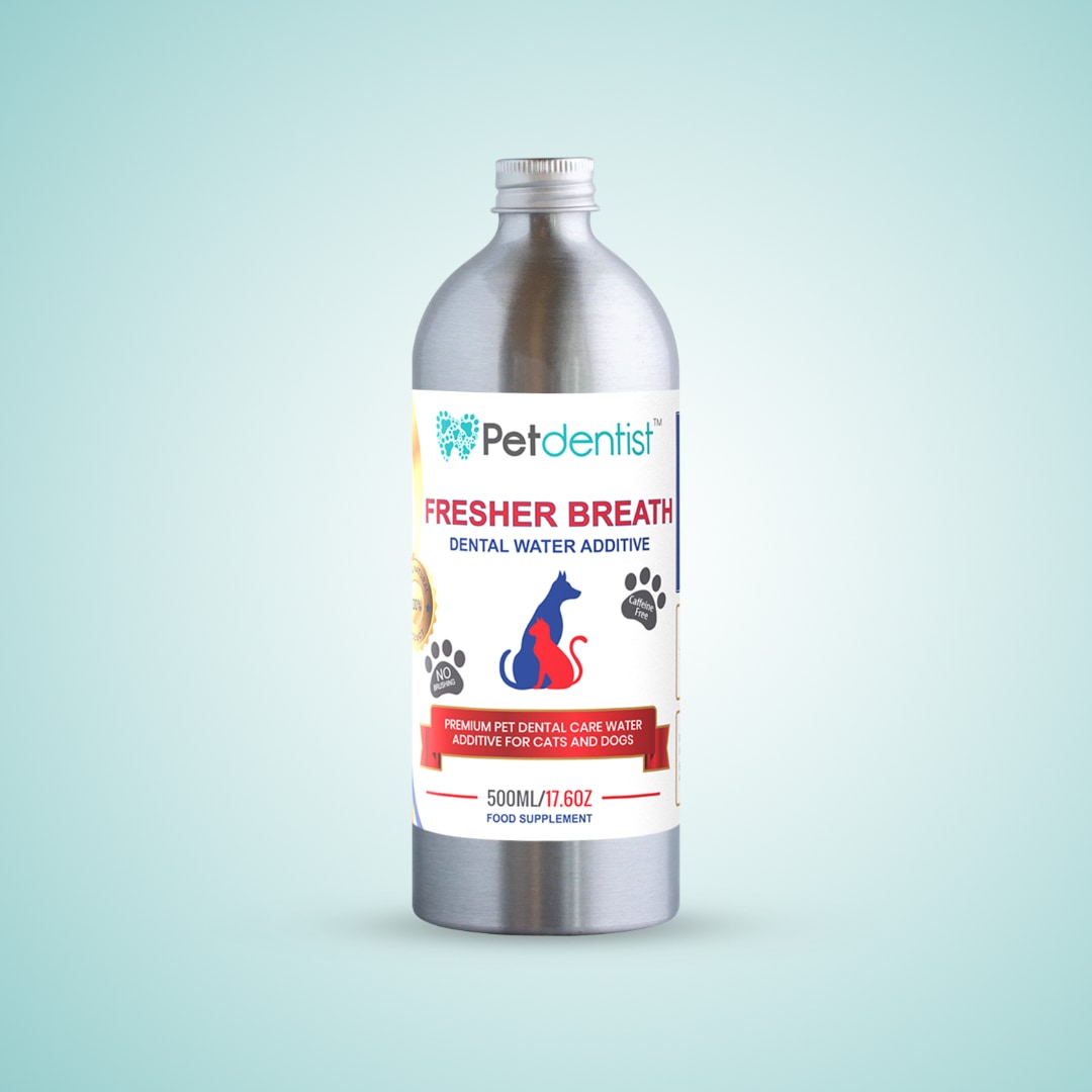 Fresher breath dental water additive is a great breath freshener and an easy plaque remover for dogs & cats. It is made of 100% natural ingredients. It is caffeine-free and stevia free as well. This is an easy-to-use additive for your pet's mouth cleaning.