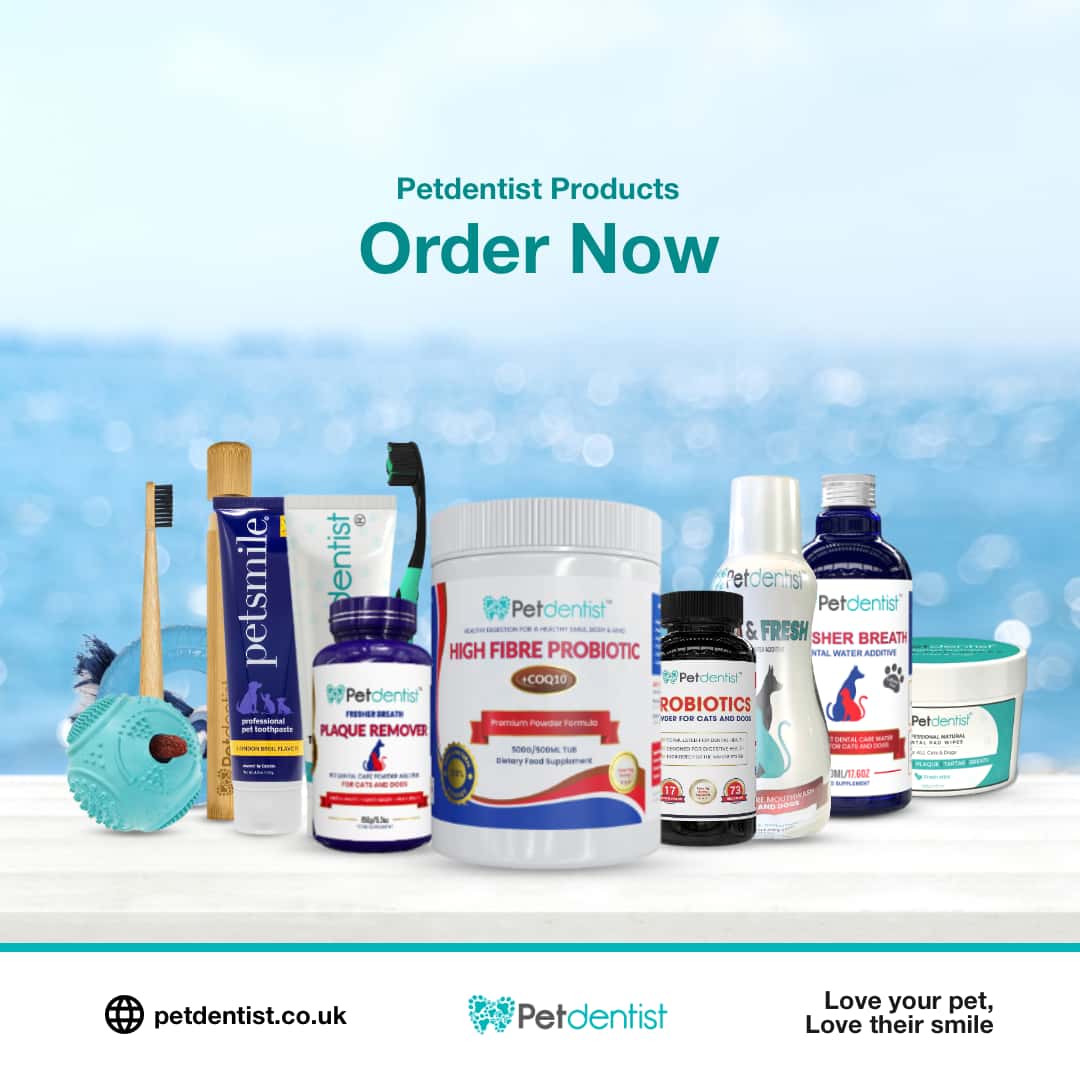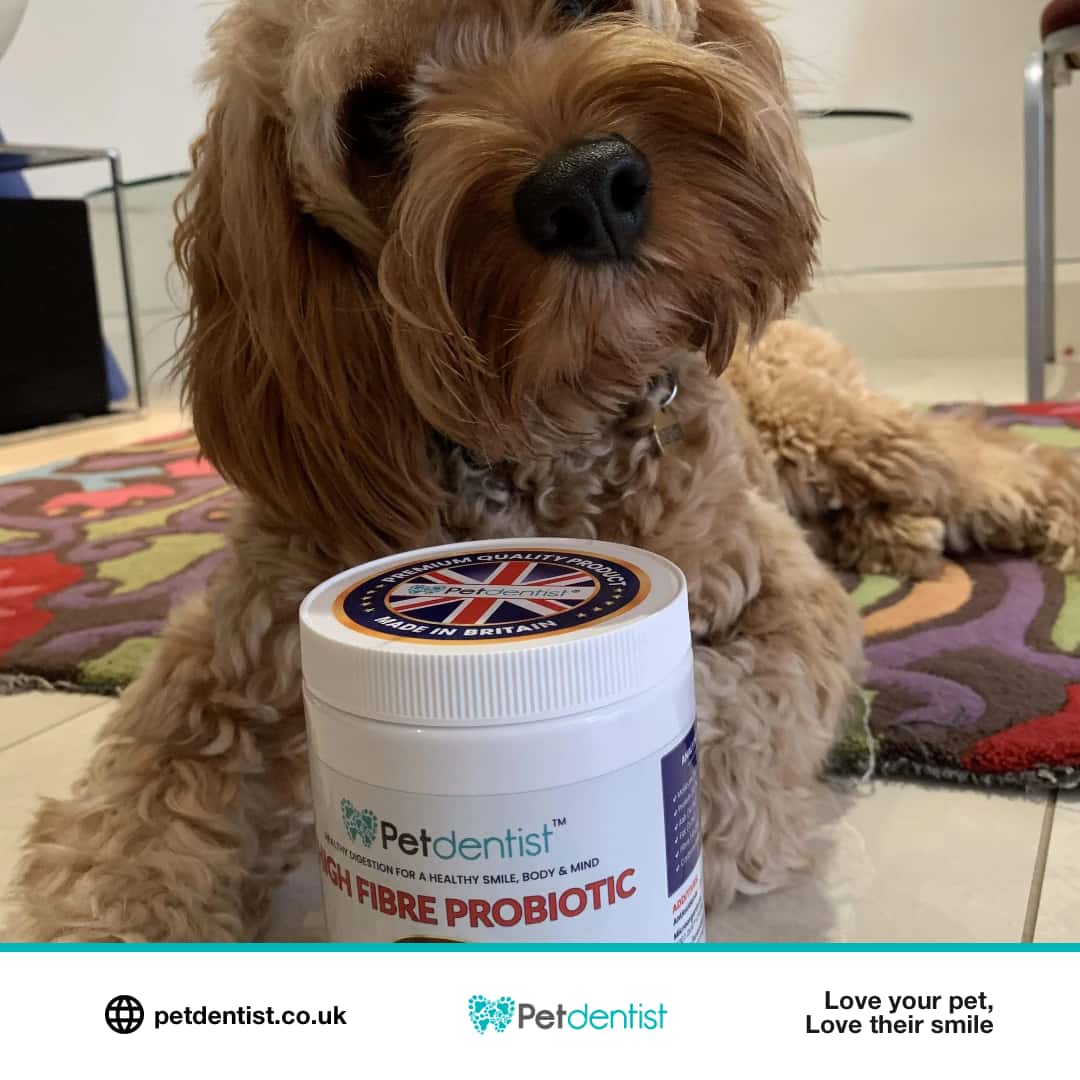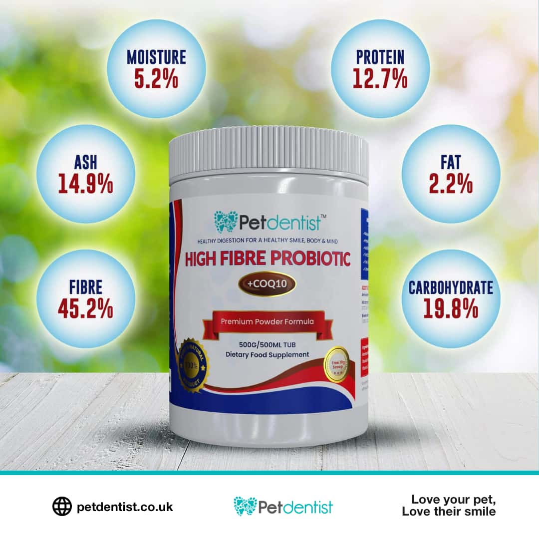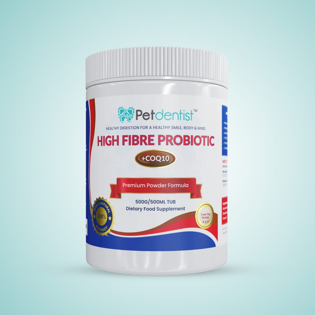 - Petdentist® High Fibre Probiotics is available in a large 500g tub with a 10g scoop included.